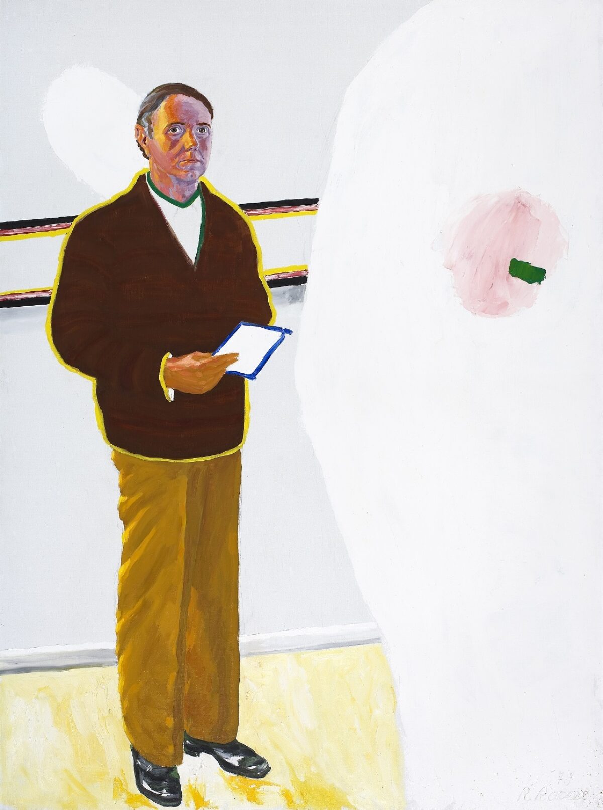 In de jaren 1970 schildert Raveel vaak werken waarin hij de thema’s schilderkunst en kunstenaarschap beschouwt of in vraag stelt. Zelfportretten duiken in deze periode vaak ook, dikwijls in schildersjas maar ook in eenvoudige, dagelijkse outfit, zoals hier. Raveel beeldt zich realistisch af terwijl hij onverstoorbaar de ruimte in kijkt. In zijn hand houdt hij iets wat lijkt op een vel papier dat leeg is, blanco, net als het witte vierkant. Rechts van de schilder zien we een organische vorm dat doet denken aan een wolk. Het felle wit lijkt uit te dijen in de omgeving van het schilderij: het werk versmelt met de tentoonstellingsruimte.