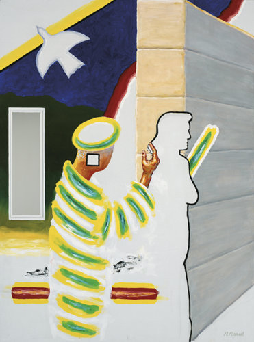 In het latere werk van Roger Raveel duiken thema’s op als geboorte, schepping, oorlog en dood, vaak met magisch-realistische inslag. De verfbehandeling wordt ook magerder, vluchtiger, contemplatiever. In deze werken komt de complexiteit van Raveels beeldtaal volledig tot uiting: coloristische, realistische en abstracte zones, vlakke en ruimtelijke partijen, een spiegel die de omgeving binnen het schilderij trekt, bepalen de plastische levendigheid van het geheel. In dit werk beeldt Raveel zichzelf af als kunstenaar-schepper. Met een simpele lijn – waarin we duidelijk het profiel van Zulma herkennen – wekt hij zijn echtgenote tot leven. De diagonaal opvliegende duif zorgt voor beweging en dramatiek.