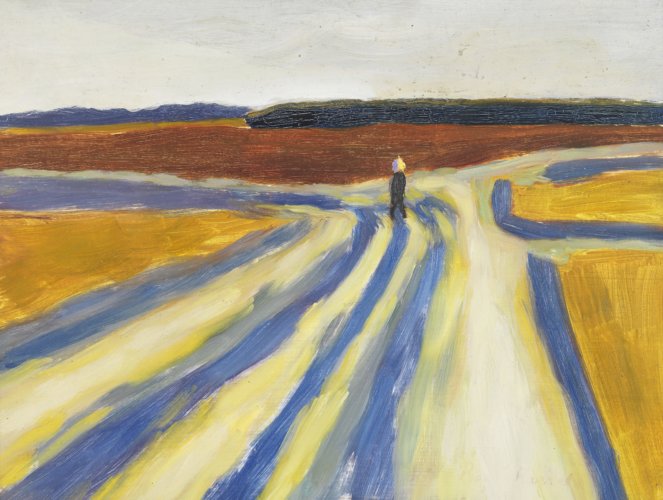 Dit is een apart werkje binnen het oeuvre van Raveel dat met weinig andere te vergelijken valt. Vanaf 1948 zien we Raveels visie ontstaan, waarvoor hij zich weliswaar laat beïnvloeden door enkele notoire voorgangers. Het landschap in dit schilderij wordt herleid tot enkele vlakken en brede lijnen die diepte suggereren. De nietigheid van de figuur en de expressieve verfstreken geeft doen denken aan het werk van Edvard Munch. Ook noties als eenzaamheid en bevreemding zijn aanwezig.
