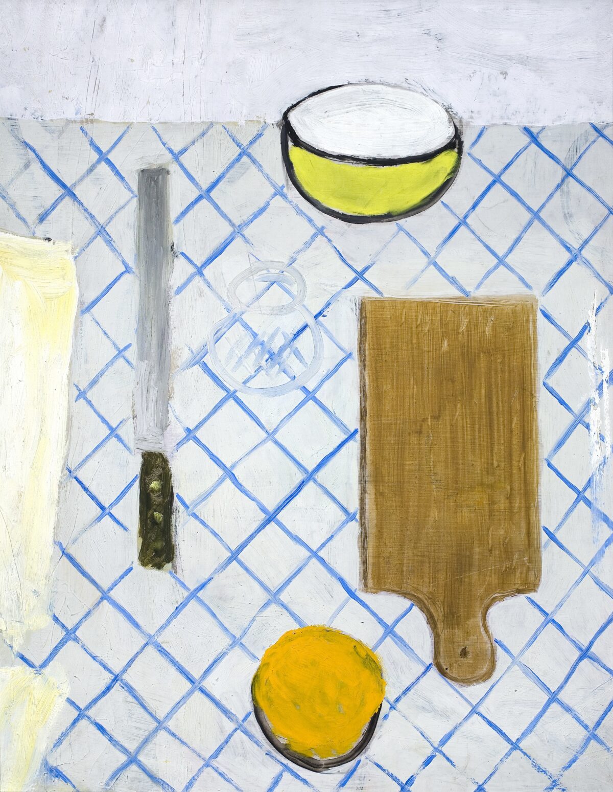 In de periode eind jaren 1940 tot begin jaren 1950 vervaardigt Raveel tal van stillevens. Vaak (schuin) vanuit bovenaanzicht schildert hij een triviale voorwerpen die op een tafelblad rusten. Raveel denkt vanuit de voorwerpen zelf, onderzoekt hoe ze zich onderling verhouden en geeft ze elk een passende plastische vertaling: het tafelkleed wordt een ruitjesmotief, een gelig vlak zou een krant kunnen suggereren, het hout en het metaal van de broodplank en het mes worden voelbaar gemaakt, een doorzichtig kolfje of flesje is nog heel summier aangegeven. Rechts zien we twee mysterieuze pasteuze vegen over het tafelkleed heen: een restant van een nauwelijks aanwezig voorwerp of een puur schilderkundige ingreep?