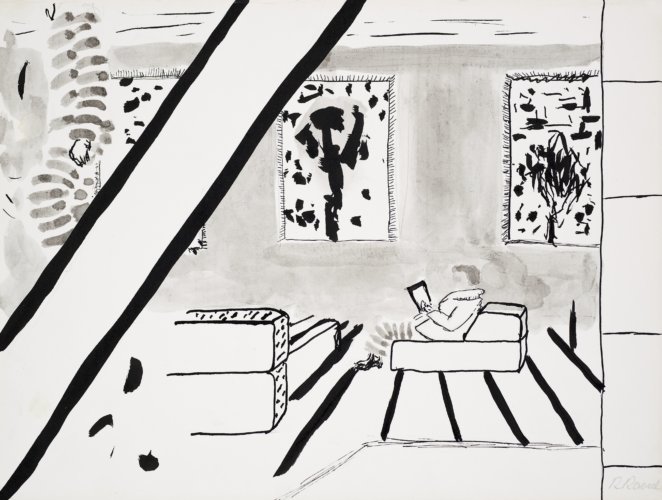 De eigenaars van Galerie Espace, Eva Bendien en Rutger Noordhoek, zijn goede vrienden geworden van Roger en Zulma. Bij de vele tentoonstellingen in Nederland verblijven Roger en Zulma dan ook geregeld bij Eva en Rutger in Amsterdam. Dit is vastgelegd in deze inkttekening waarop we Zulma lezend zien afgebeeld in de gastenkamer van galerie Espace.