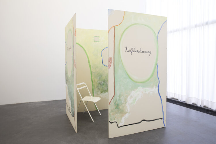 In 2006, Raveel, then already 85 years old, created an installation entitled ‘Introspection’. He had four panels mounted in pairs and painted them. There is a chair between the two pieces on which the visitor can sit: he or she becomes part of the artwork, especially when he or she sees himself or herself appear in the mirror opposite the chair. The artist invites us to engage in self-reflection both literally and figuratively in the contemplative peace of his painting, which, as is typical of his later works, is fleeting, ethereal, in soft colours.