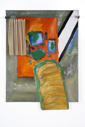 Raveel is fascinated by the fact that the painting does not end at the frame and can continue in its environment or take in its surroundings. From the early 1960s, he regularly attaches found objects to his paintings: wooden slats, a stick, a birdcage, mirrors, a window, a coat rack, etc. He shares this interest with the artists of the French nouveau réalisme but also the American artist Robert Rauschenberg, who develops his combine paintings in the same period. In The little curtain, we discover an abstract-looking painting that creates the image of a character looking out through a window. The figure protrudes from the bottom of the painting, as if it is in 'our' reality and has opened the curtain to 'look outside', like a painting within a painting.