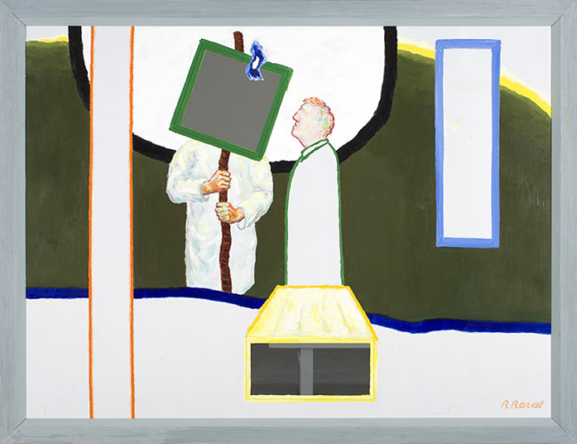In 1993, Roger Raveel and his work were celebrated at the international art event Poƫziezomer in Watou, West Flanders. Today, his mural at the Douviehoeve serves as a reminder of this event, as does his sculpture on the market square, a silhouette of Hugo Claus. Hugo Claus wrote a poem to mark the event, which subsequently served as inspiration for this 1993 painting. At the centre of the work, we see the recognisable silhouette of Hugo Claus looking up at one of the mirrors, seemingly speechless. The two mirrors in the painting each have a different function. The mirror at the bottom embodies the eerie chill of death. We stand as spectators with our feet in the grave. The mirror that is placed askew, dangling like a flag on a stick, brings space and life into the image. It is as if the painter is holding up a mirror to us in which the world is tilting out of dizziness. The title of the work refers to the poet Hugues C. Pernath, who died in 1975.
