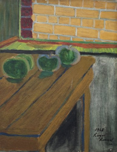 From 1948, Raveel wants to look at his surroundings with fresh eyes. It becomes a productive year. Numerous paintings were created, rather limited in format: landscapes, Zulma in her daily activities, still lifes, ... In these, a synthetic view of reality stands out above all. Things are reduced to their essence, without abstracting them. In the mood of the whole, Raveel makes visible the plastic and spatial relationships between the various elements: Raveel lets the individuality of and contrast between things speak in bright colours.