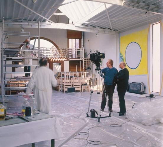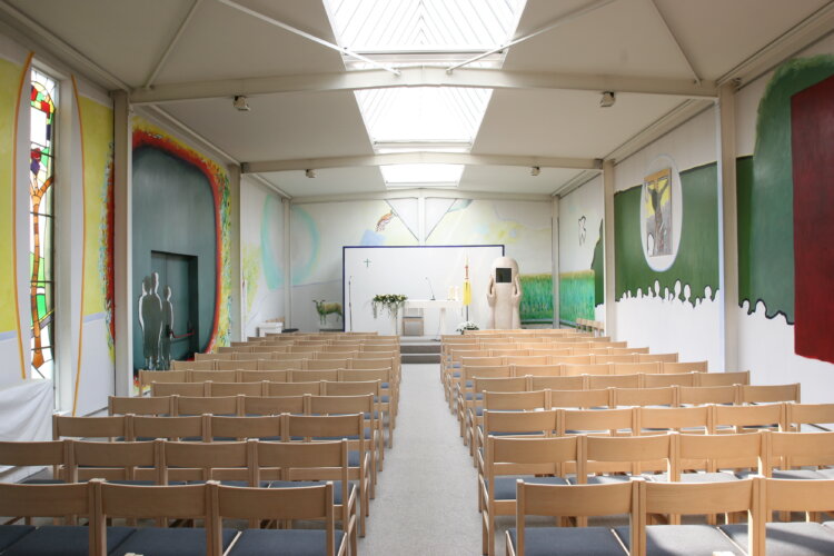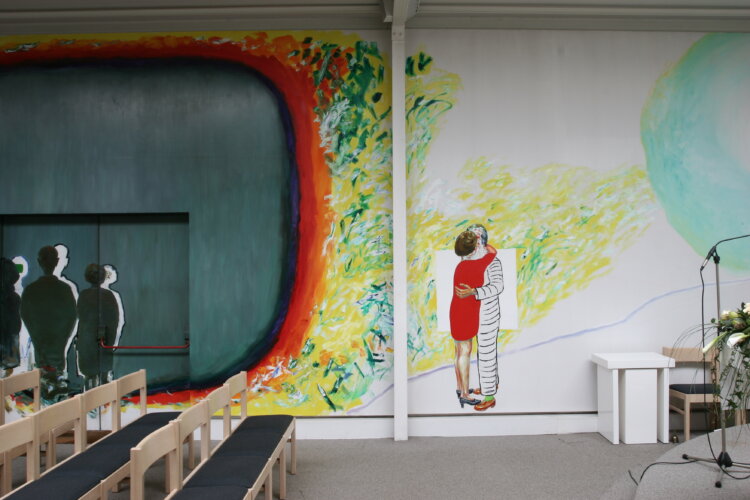 In the late 1980s, the parish priest of Machelen-aan-de-Leie invited Raveel to decorate the new chapel and place of worship Maria Hulp der Christenen (Mary Help of Christians). He turned it into a total work of art, which took him four years to complete. It consists of secular and religious frescoes, paintings, a large ceramic sculpture and a stained-glass window that merge under the title The Religion of Life. Raveel also took care of the interior design, including a simple white altar.