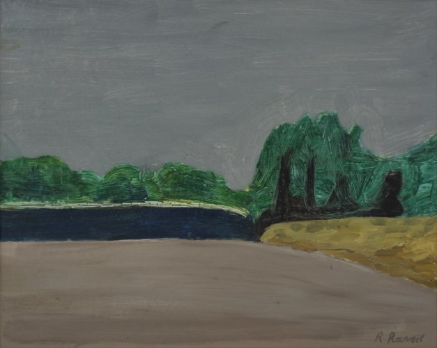 L’année 1948 est particulièrement productive pour Roger Raveel, alors âgé de 27 ans. Cette période peut être considérée comme le tournant d’une extraordinaire évolution artistique. Les œuvres qu’il produit à cette époque témoignent de l’émergence des caractéristiques de son langage visuel. Il peint une quantité considérable de tableaux, de petit format pour la plupart, sur du carton dur – un matériau destiné à remplacer la toile de peinture trop coûteuse. Inspiré par l’environnement rural, Raveel formule une vision synthétique de la réalité qu’il exprime dans des couleurs vives et des formes nettes. Il réduit les choses à leur quintessence en tenant compte de l’atmosphère ambiante.