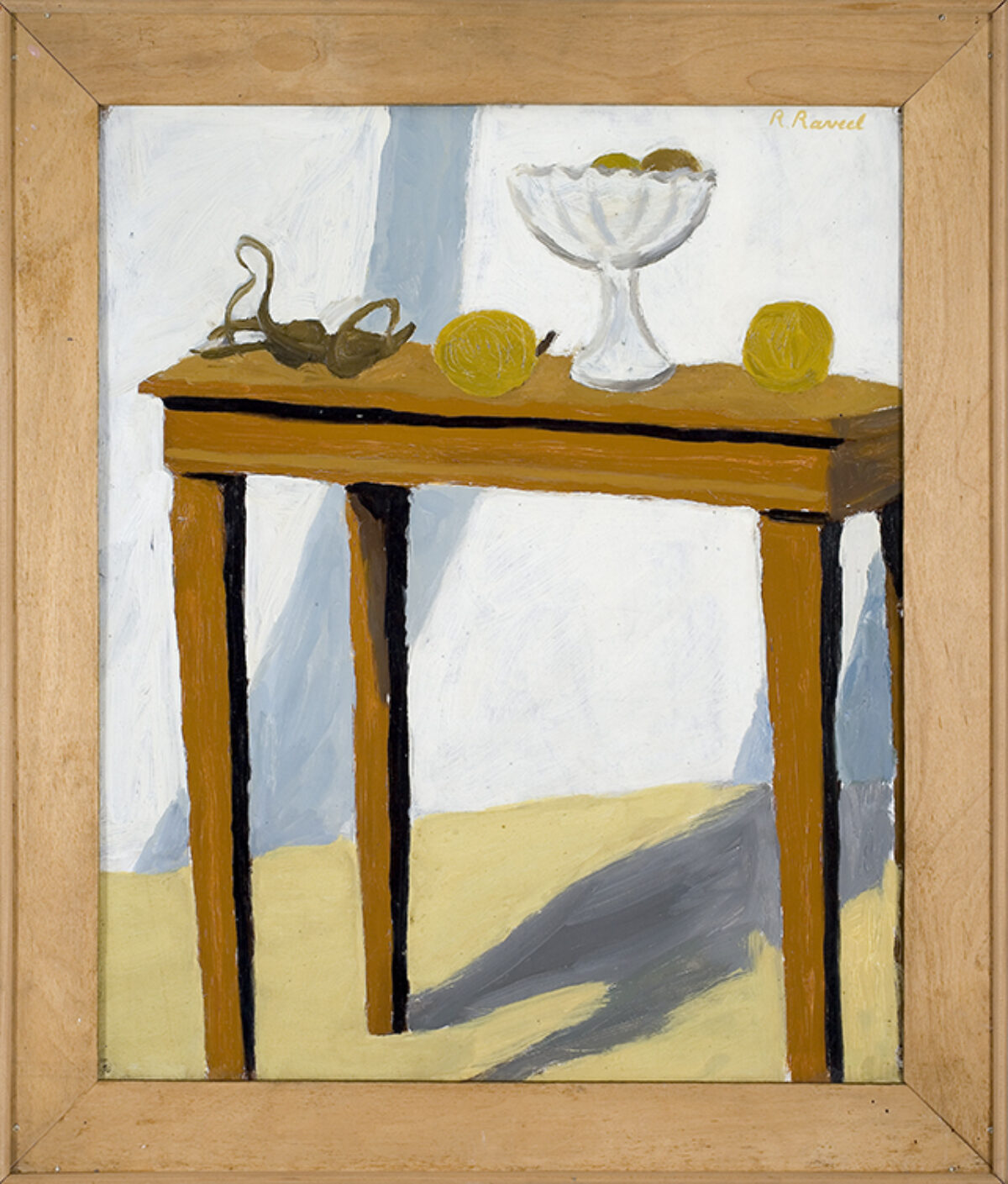 Cette œuvre fait partie de toute une série similaire de petites tables aux natures mortes que Roger Raveel a peintes entre 1948 et 1952, dans une quête d’un regard contemporain sur son environnement. Raveel ramène alors les objets à leur quintessence dans des formes et couleurs vives, appliquées en aplats. On perçoit une certaine influence de l’œuvre d’Henri Matisse qu’il a étudiée de près en tant que jeune peintre. Raveel cherche à se distancier de l’expressionnisme flamand, sombre et compact, qui a dominé la peinture jusqu’à la Seconde Guerre mondiale.