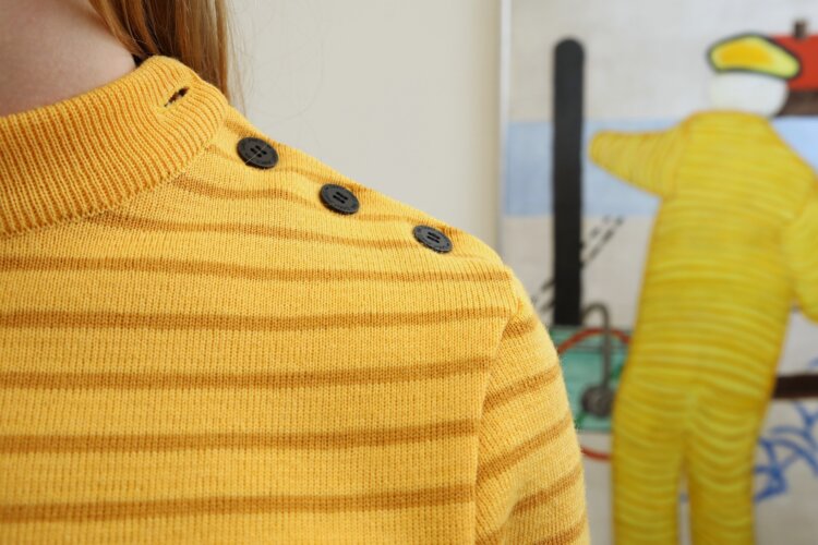 Samen met kunstenaar Sophie Nys lanceert het Roger Raveel Museum haar allereerste editie. Nys baseerde zich op het schilderij Gele man met karretje om bij Saint James, het befaamde Franse merk van Bretoense visserstruien, een unieke wollen trui te laten creëren.
