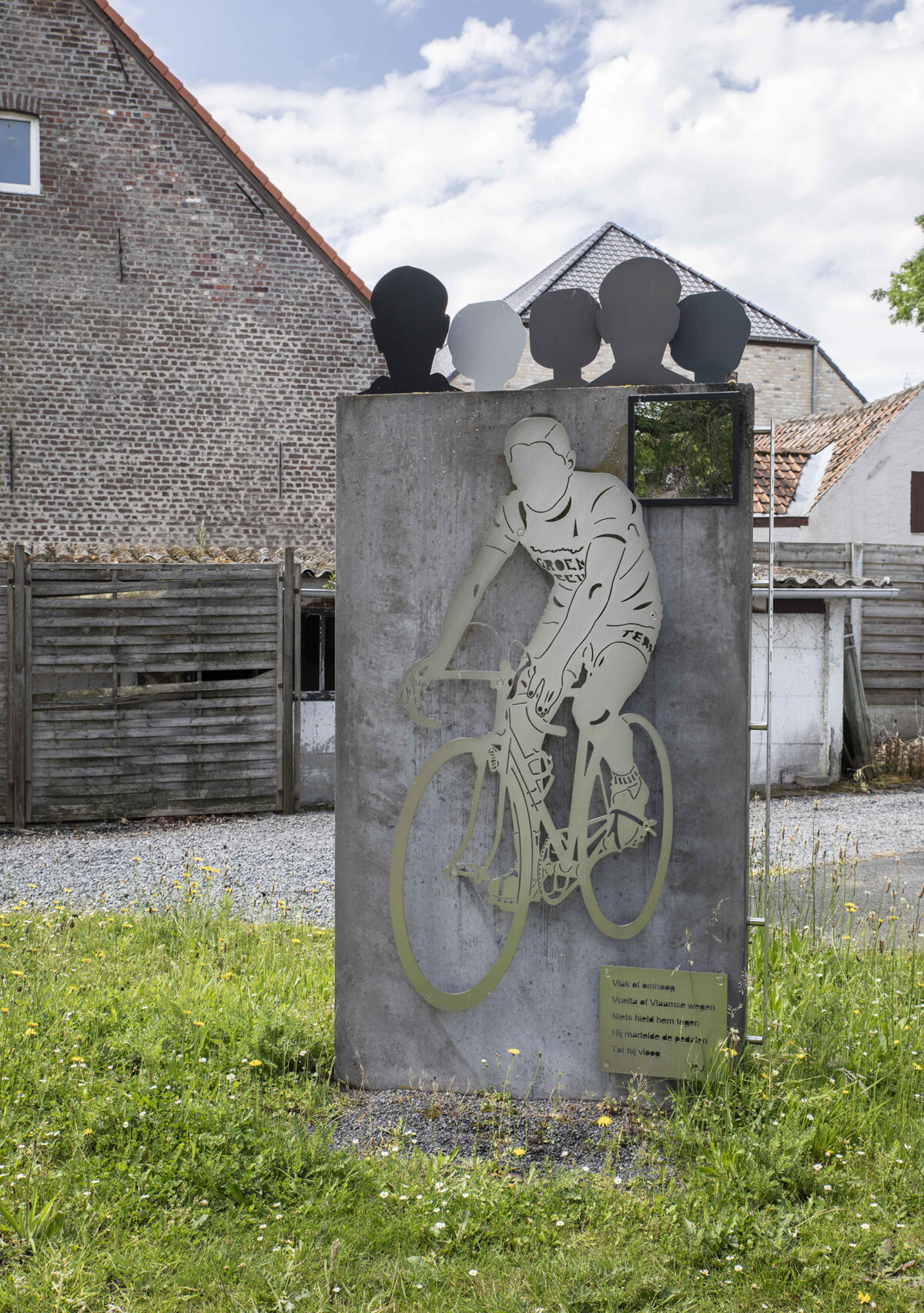 At the roundabout stands a monument designed by Raveel for cyclist and village resident Frans De Mulder (1937-2001). The monument was unveiled in 2010, fifty years after De Mulder's victory in the Tour of Spain. You can recognise the typical Raveelian silhouettes of the heads and the mirror. A poem by Roland Jooris can be read on the side of the sculpture.