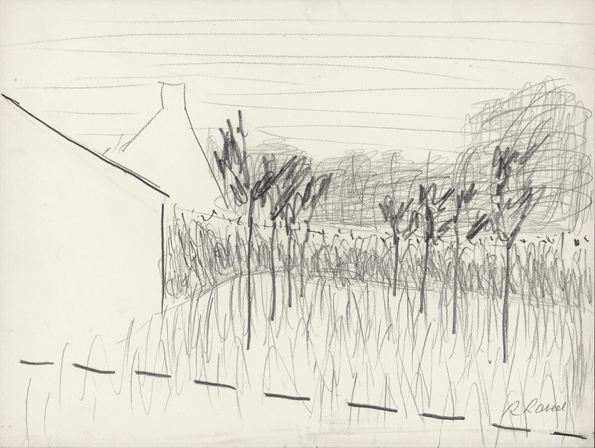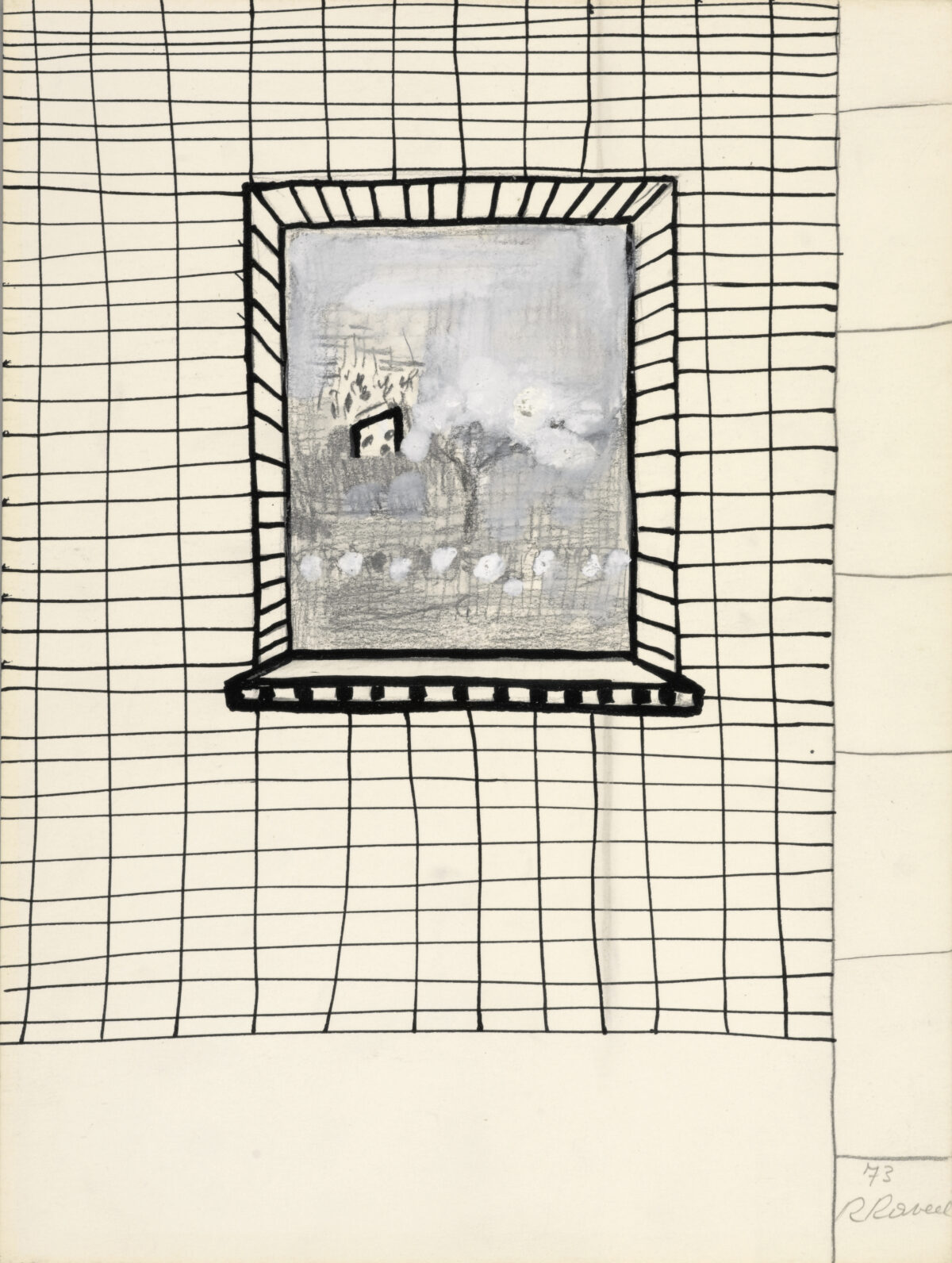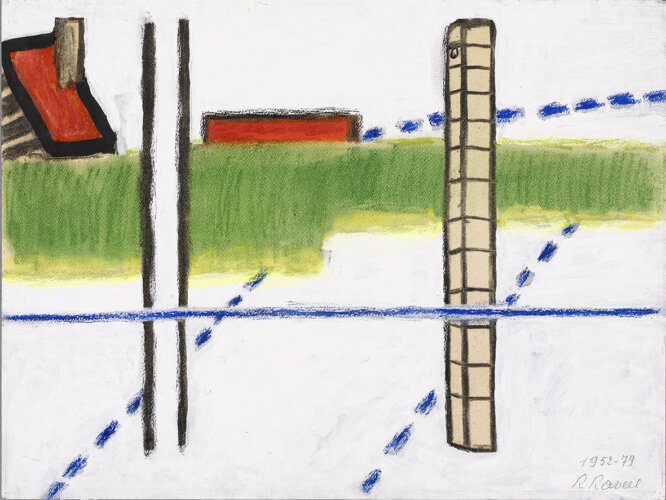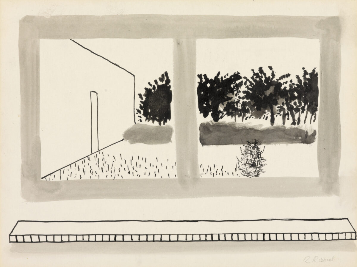 Dans les petits jardins à l’avant des maisons et derrière leurs murs se déroule la vie quotidienne des habitants, de même que celle de Raveel. La simplicité de ce quotidien constitue sa plus grande source d’inspiration. Le vélo posé contre le mur, le chat dans le jardin, la théière sur le poêle : Raveel observe et peint la « petite » vie de tous les jours et donne ainsi à voir le microcosme qu’est chaque village. Dans nombre de ses œuvres, il nous offre l’occasion de regarder au-dehors, par-dessus son épaule ou par la fenêtre. Il peint pour ainsi dire l’acte de « regarder ». Ce lien entre intérieur et extérieur, ce tableau dans le tableau, cette mise en abyme donne une force toute particulière aux œuvres.