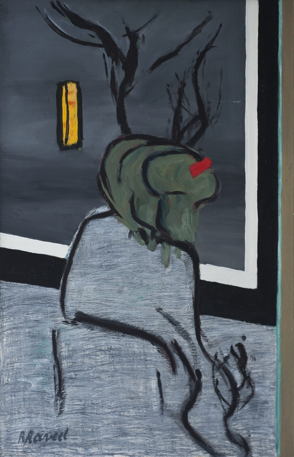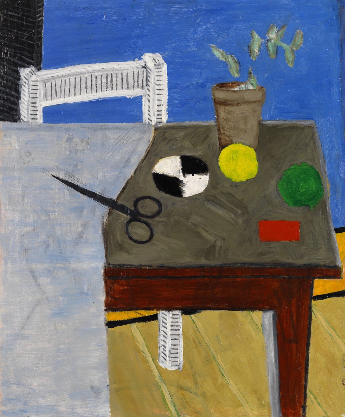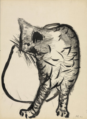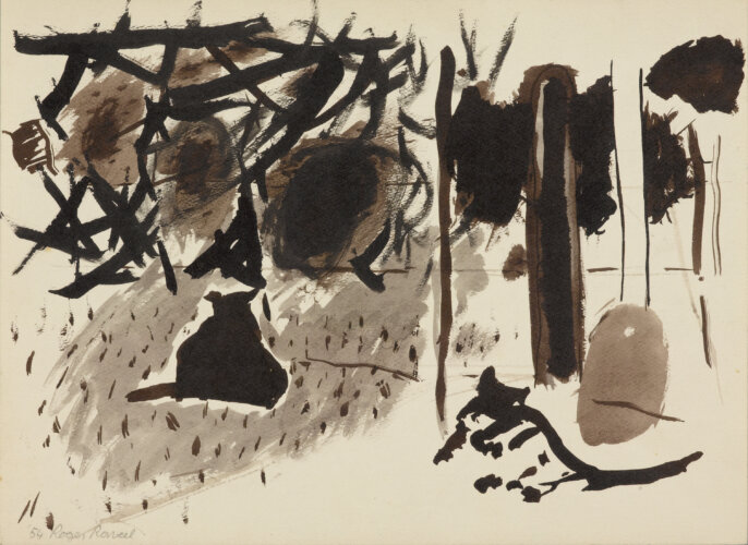 Dans les petits jardins à l’avant des maisons et derrière leurs murs se déroule la vie quotidienne des habitants, de même que celle de Raveel. La simplicité de ce quotidien constitue sa plus grande source d’inspiration. Le vélo posé contre le mur, le chat dans le jardin, la théière sur le poêle : Raveel observe et peint la « petite » vie de tous les jours et donne ainsi à voir le microcosme qu’est chaque village. Dans nombre de ses œuvres, il nous offre l’occasion de regarder au-dehors, par-dessus son épaule ou par la fenêtre. Il peint pour ainsi dire l’acte de « regarder ». Ce lien entre intérieur et extérieur, ce tableau dans le tableau, cette mise en abyme donne une force toute particulière aux œuvres.