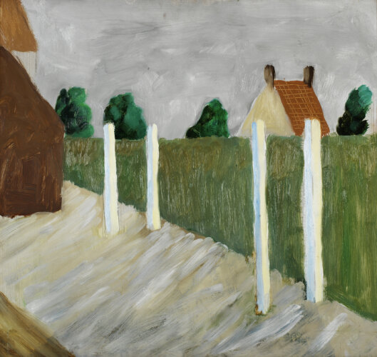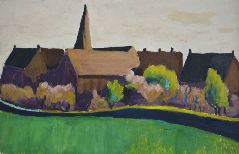 Au travers de toutes ces évolutions, on retrouve une constante : son village de Machelen-sur-Lys. Raveel y est né en 1921 et y a vécu et travaillé toute sa vie. Il aimait son village et y puisait de l’inspiration. Il a peint ce qu’il y voyait : les paysages, les maisons, les habitants du cru. Du chat au poêle, des murets en béton au linge qui sèche.